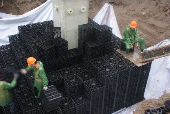 PP模塊構(gòu)筑物采用聚丙烯塑料單元模塊組合,在水池周圍包裹防滲土工布,形成地下貯水池.由于表面光滑,不滋生藻類,可使儲(chǔ)存的水體水質(zhì)保持較長時(shí)間穩(wěn)定.