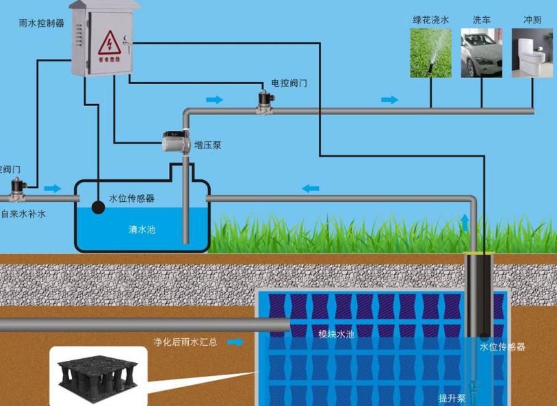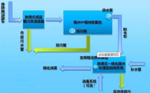 通過城市建筑屋面、道路、硬質鋪裝地面等不透水免收集雨水,通過接駁市政雨水管網,引流收集的雨水進入雨水回用系統,儲存收集的雨水.