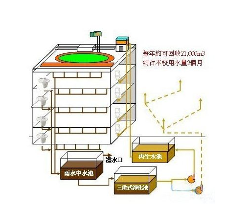 在較大面積的綠地及廣場地下可以設置地下式蓄水池或蓄水滲透池,還可以利用人工水池、人工湖等雨季來臨,可以將雨水存入蓄水池中。